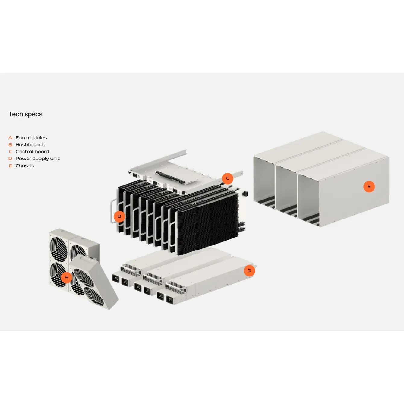 Proto Rig, optimized for the SHA-256 mining algorithm from Proto, comes with a maximum hash rate of 819TH/s for a power consumption of 12000W. With an efficient air cooling system, Rig dissipates heat effectively, preventing machine overheating while aiding an excellent energy efficiency of 14.65 j/Th.